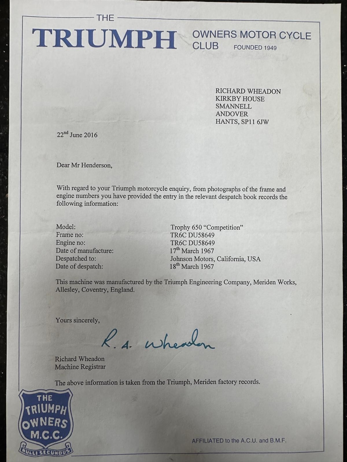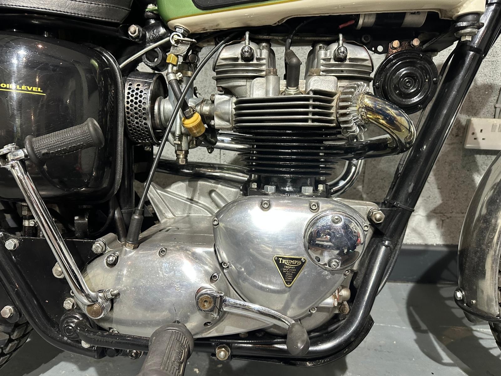 Absolutely stunning 1967 Triumph Trophy 650 Competition. Triumph owners Club certification stating that its a matching numbers 1967 Trophy 650 “ Competition” The bike was originally supplied to Johnson Motors in California and then brought back to the UK in 2016 when it was completely restored to a very high standard. This bike sounds as good as it looks and is an absolute pleasure to ride.